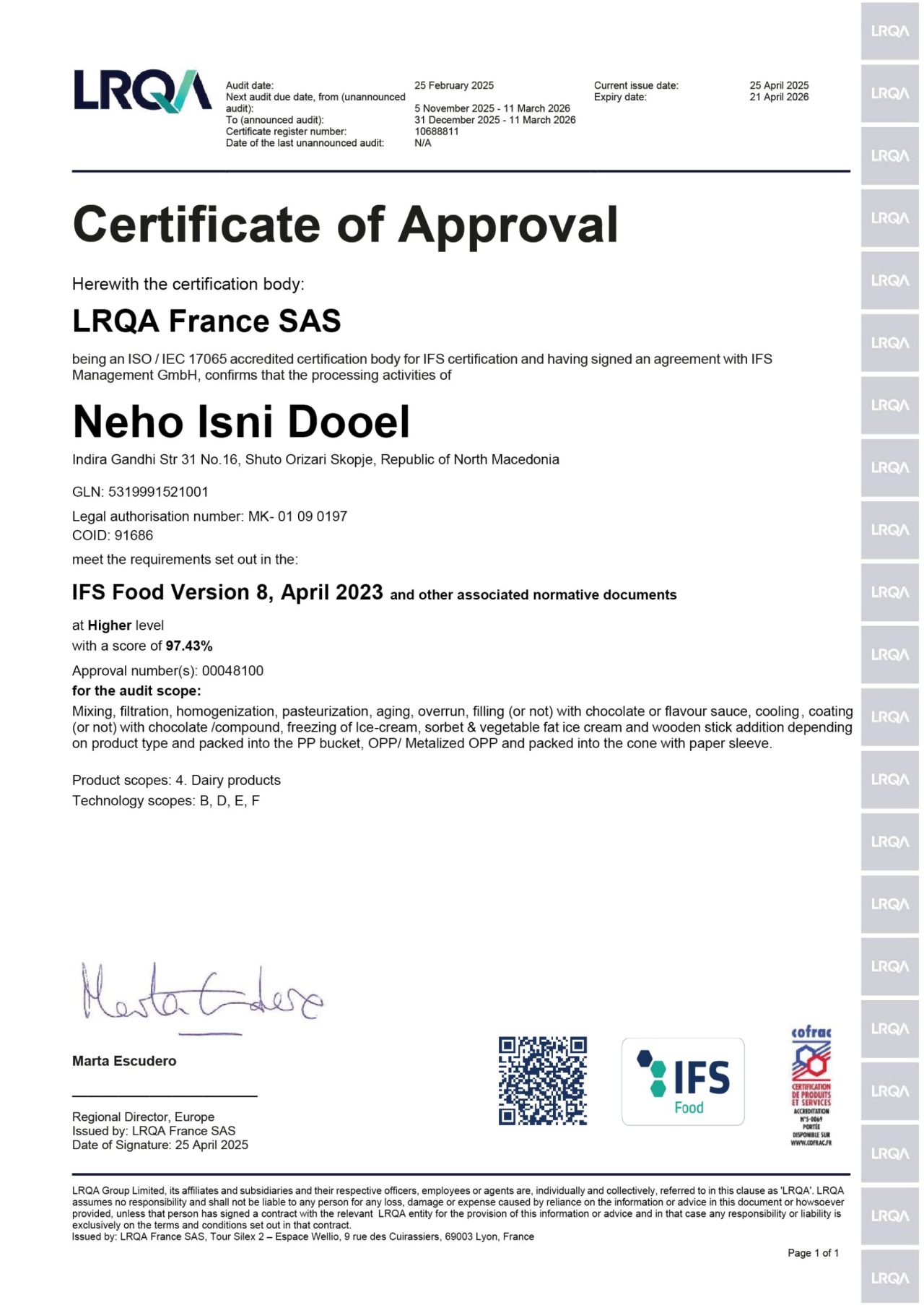 SKOPJE, NORTH MACEDONIA – 17 October 2025 – Neho Isni Dooel, a premier manufacturer of high-quality ice cream, today announced it has successfully achieved the International Featured Standard (IFS) Food Version 8 certification at ‘Higher Level’. The certification was awarded following a comprehensive audit by LRQA, where Neho achieved an outstanding score of 97.43%.