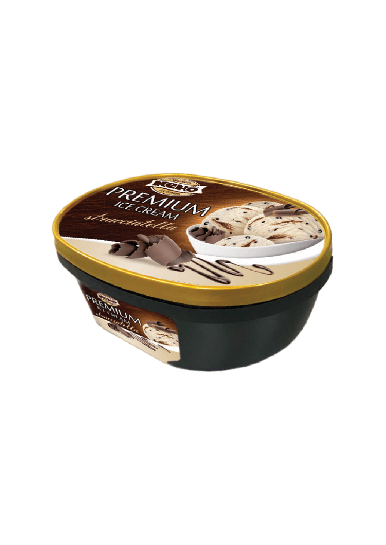 Vanilla ice cream with chocolate pieces decorated with Belgian chocolate